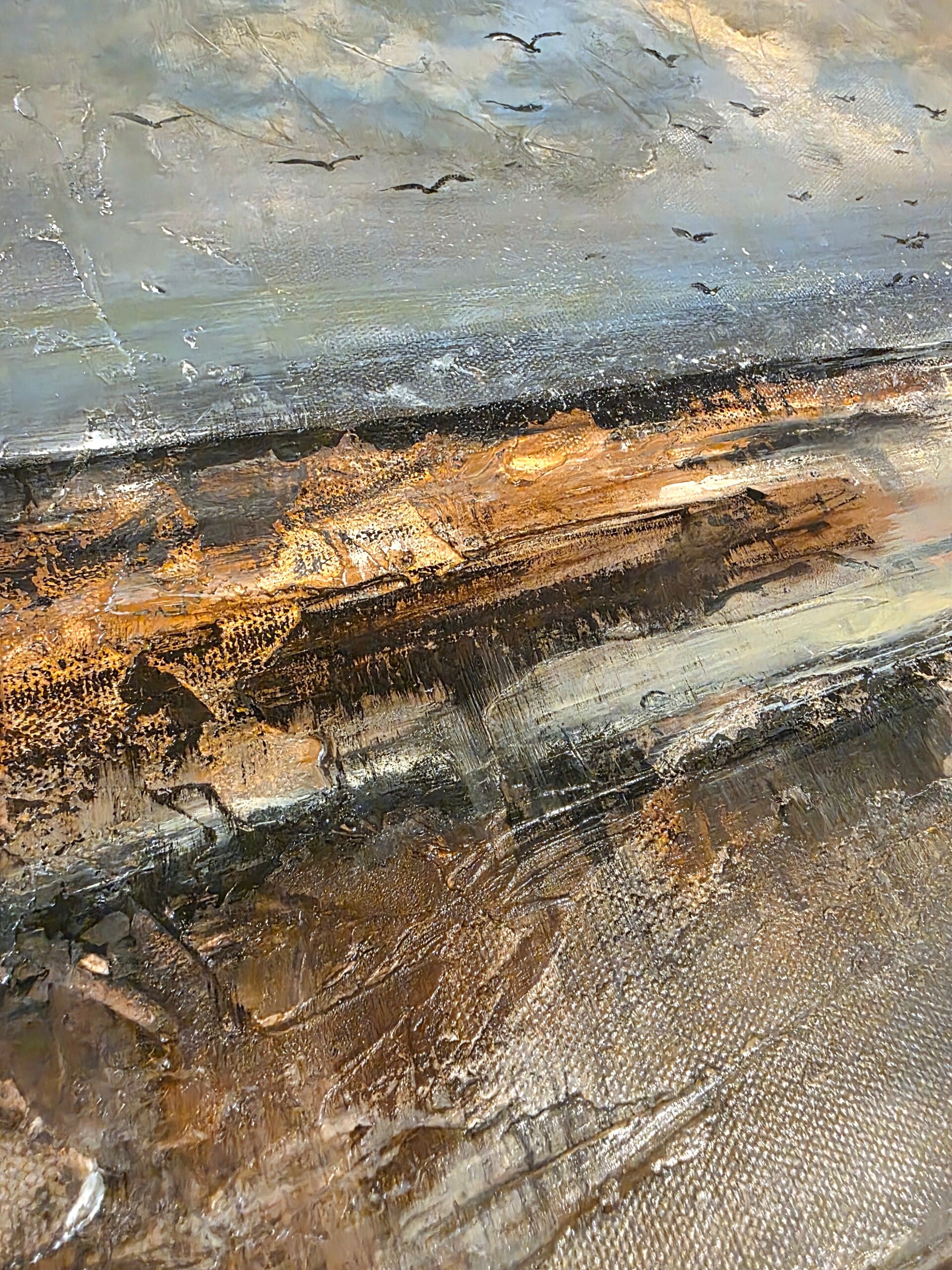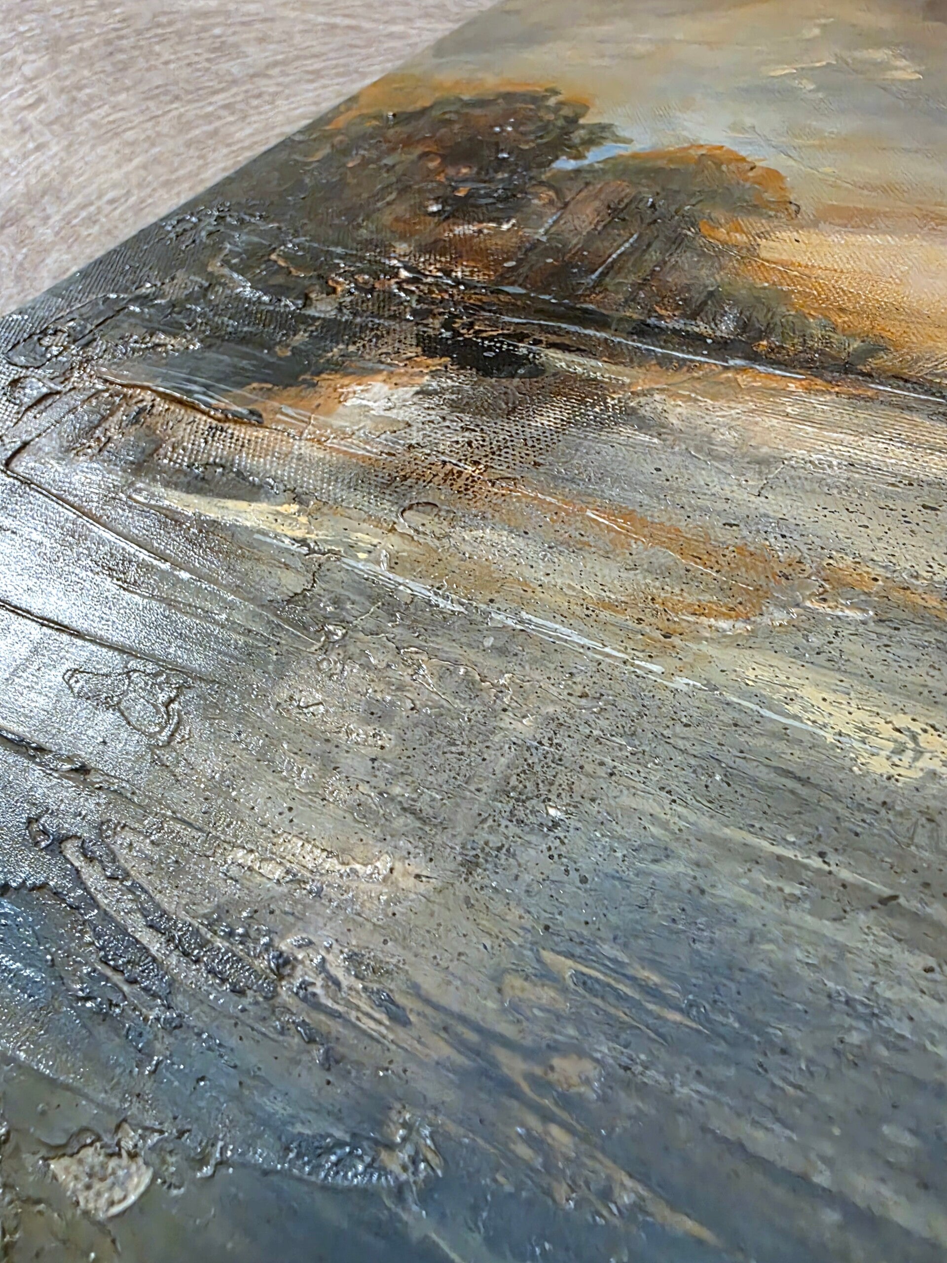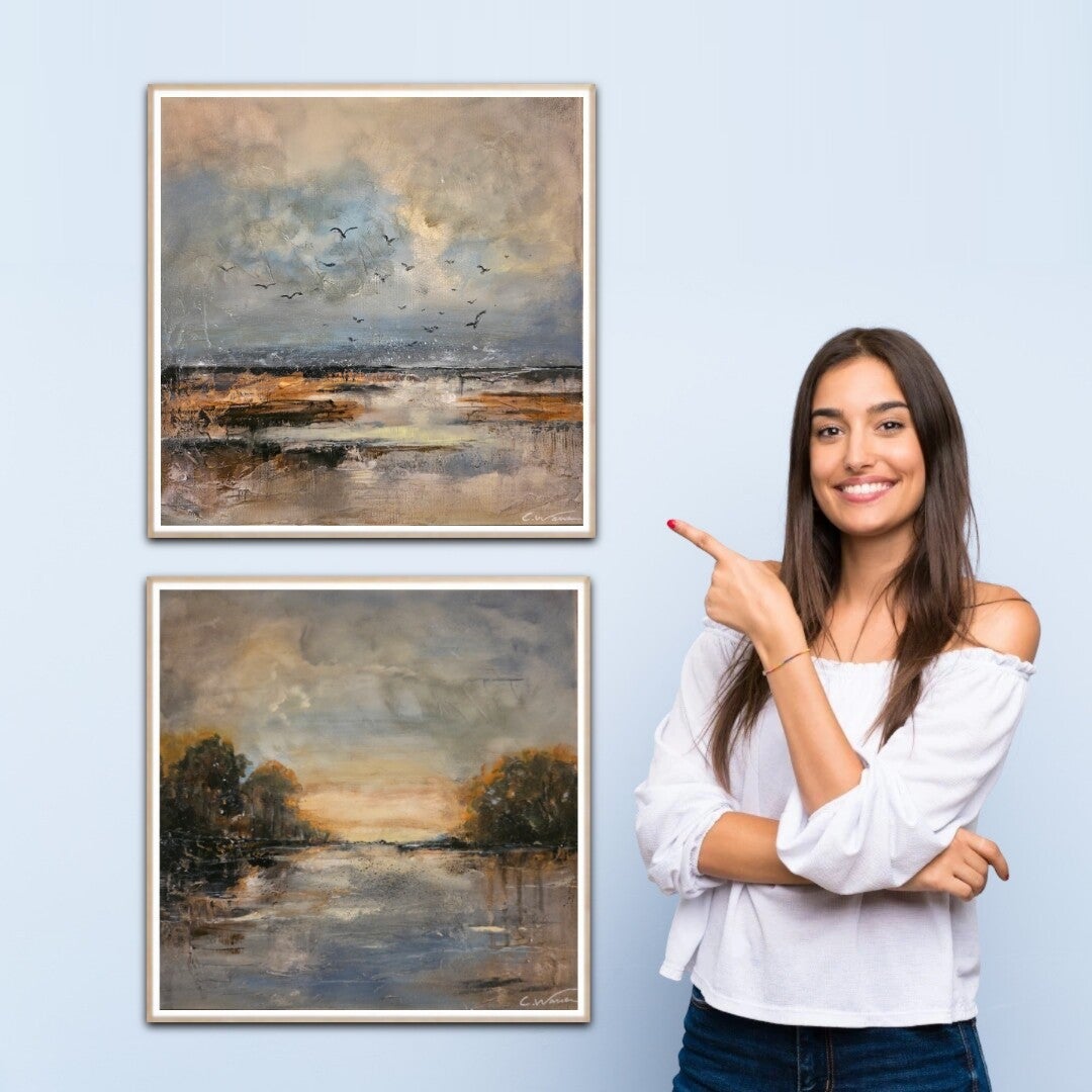 A serene pair of impressionist landscapes designed to bring the tranquility of the coast into your home. This diptych captures a moment of quiet tansition and utilizes a muted palette of blues, grays, and warm earth tones with textured brushstrokes to evoke a sense of movement. Hung together, the pair form a cohesive, peaceful energy in any room.