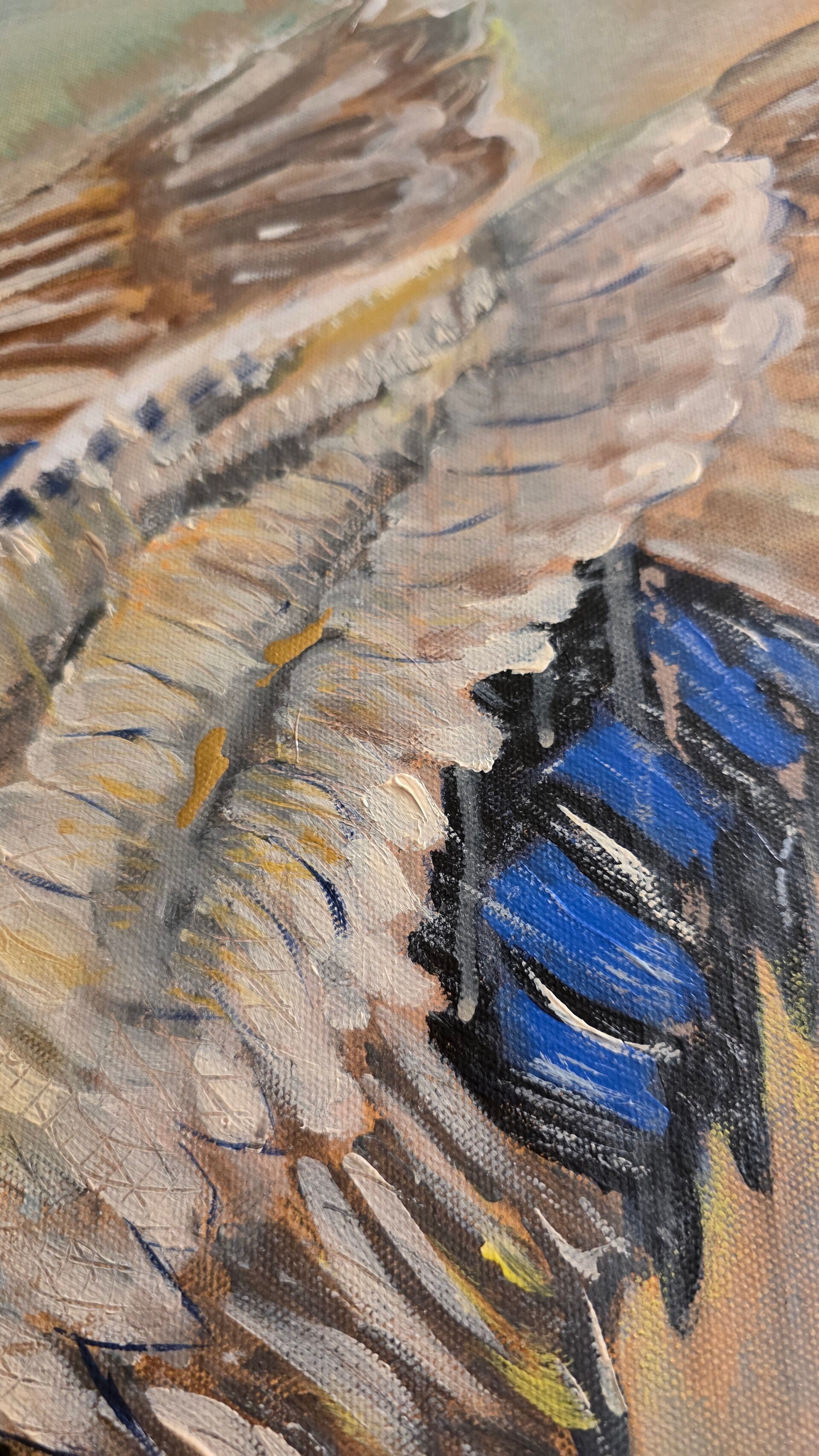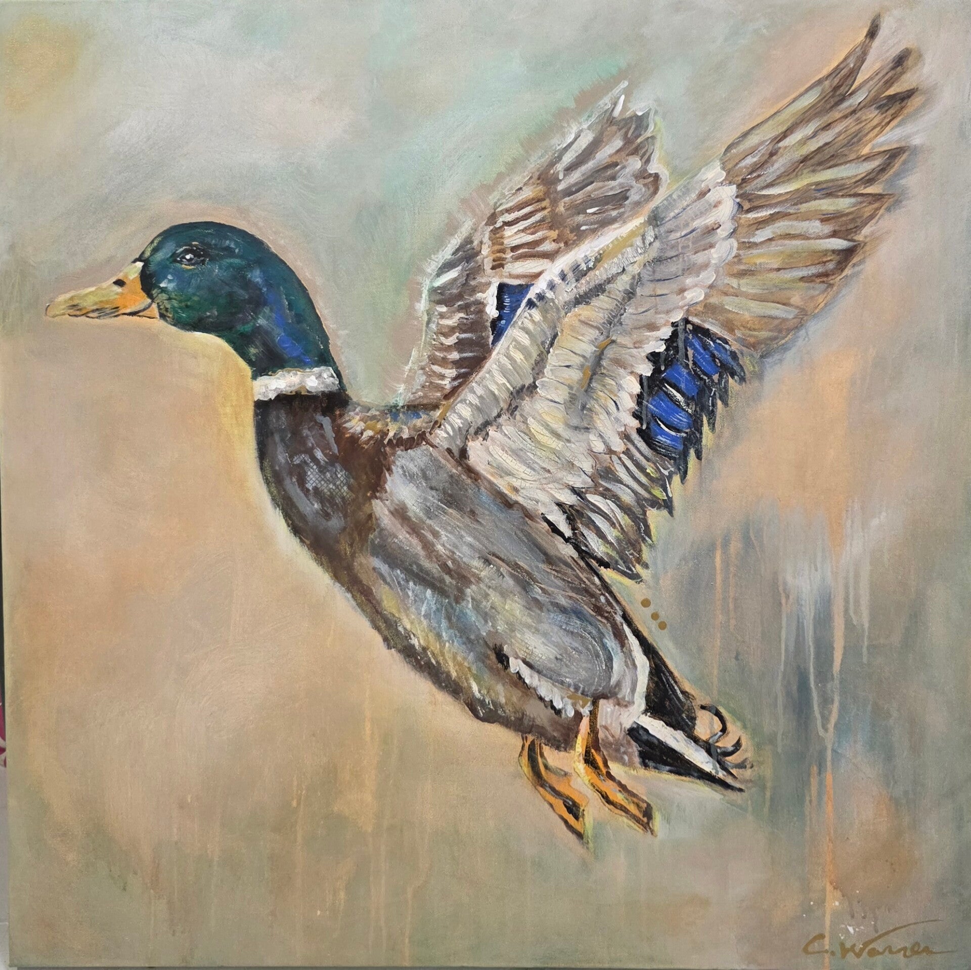 Capture the dynamic energy and grace of a mallard in mid-flight. This painting uses vibrant, natural colors to enhance the natural scene and brings the great outdoors into any home, lake house, or cabin.